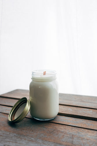 White DIY jar candle on wooden table with natural light.